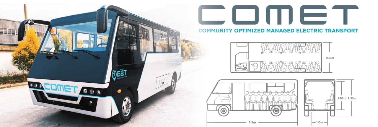 The COMET is a fully electric vehicle that uses fast-charging lithium-ion batteries. The COMET has a 30 passenger capacity, is air-conditioned and is accessible for people with disabilities.